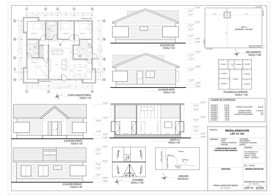 Diseño, tramitación de permiso de edificación, supervisión de la construcción de una vivienda de 2 pisos y quincho con un total de 258,58 m², con estructura mixta en Albañilería en primero piso y pilares metálicos con muros de madera en segundo piso.